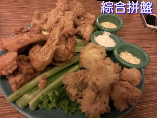 我們的綜合拼盤有炸香菇、酥雞柳條、水牛辣雞翅